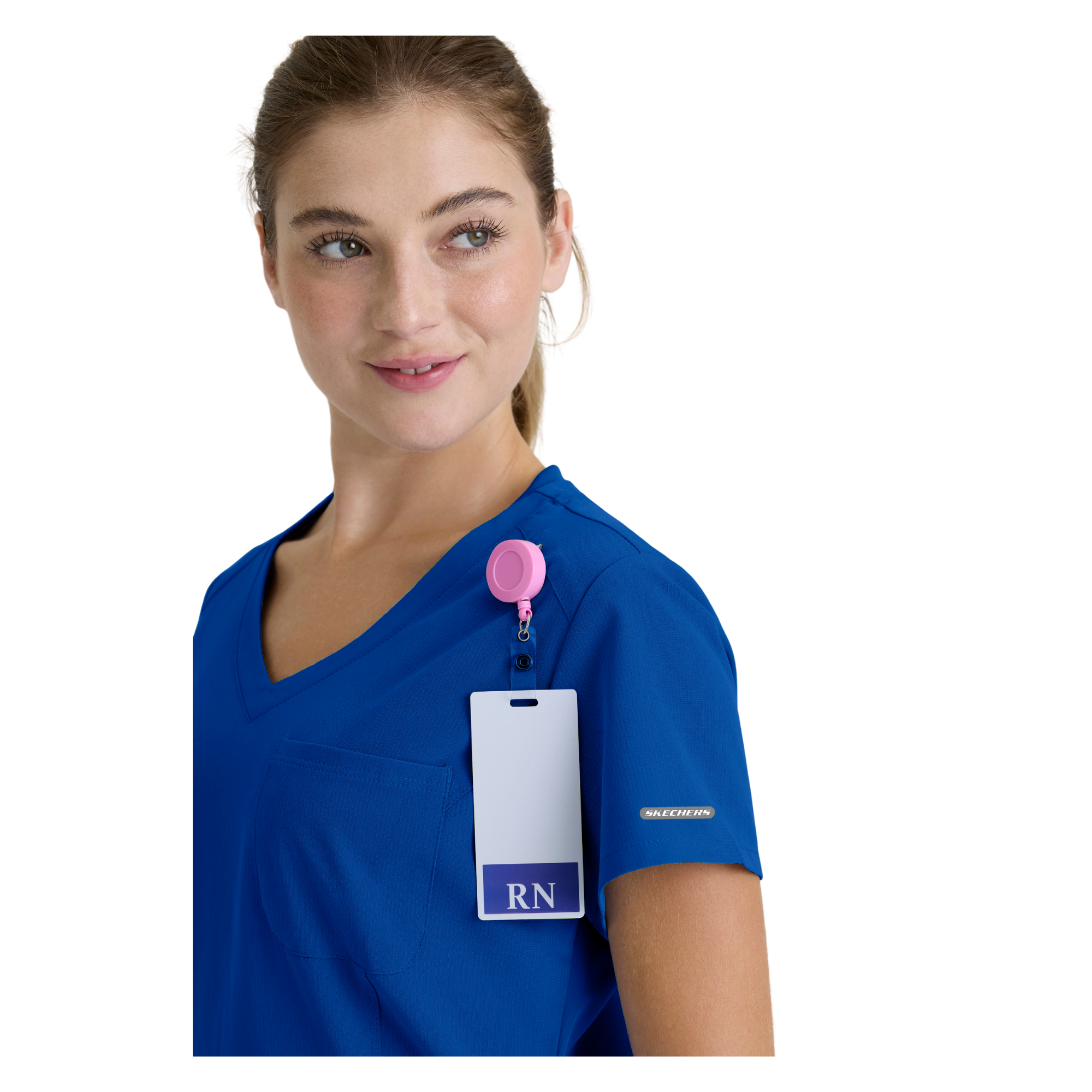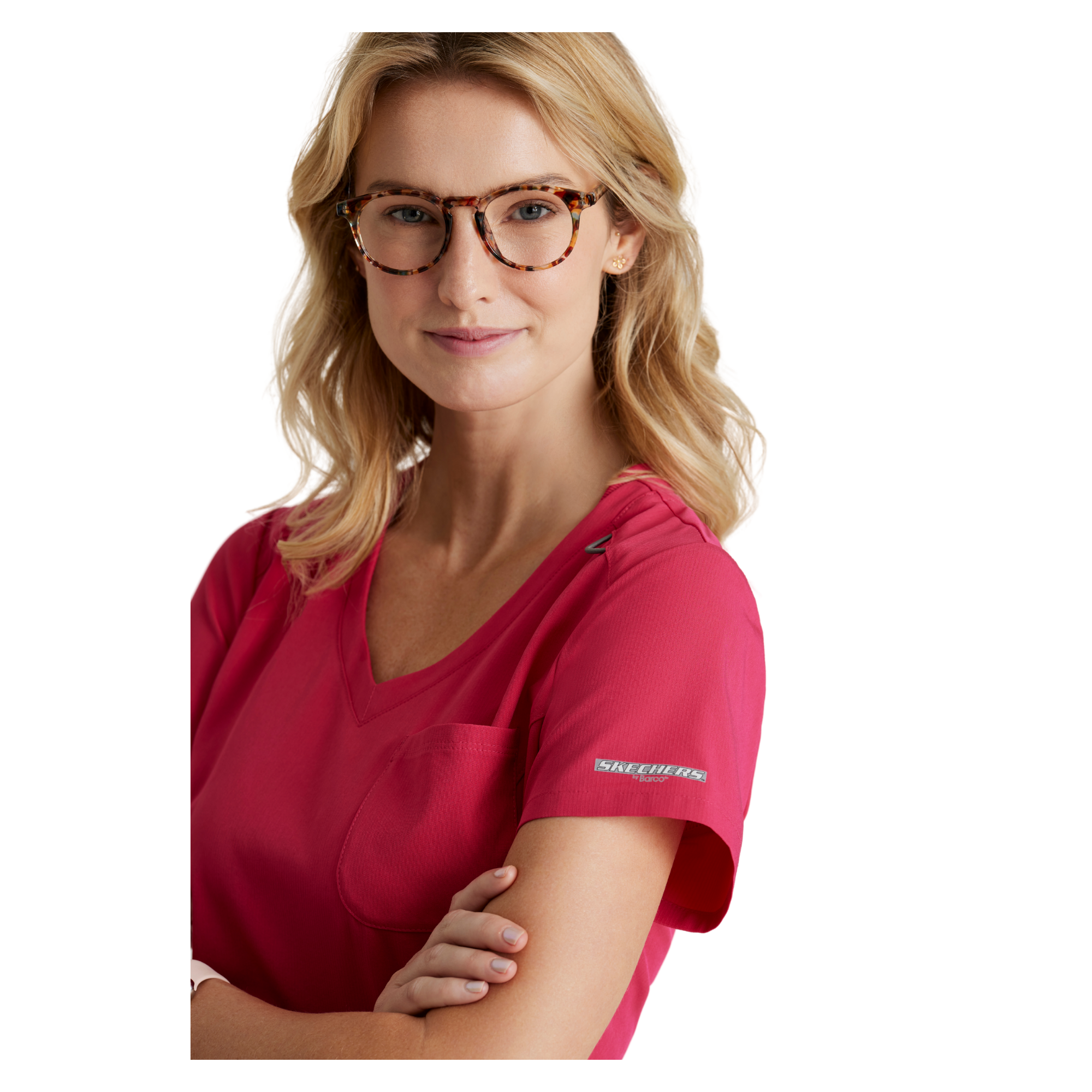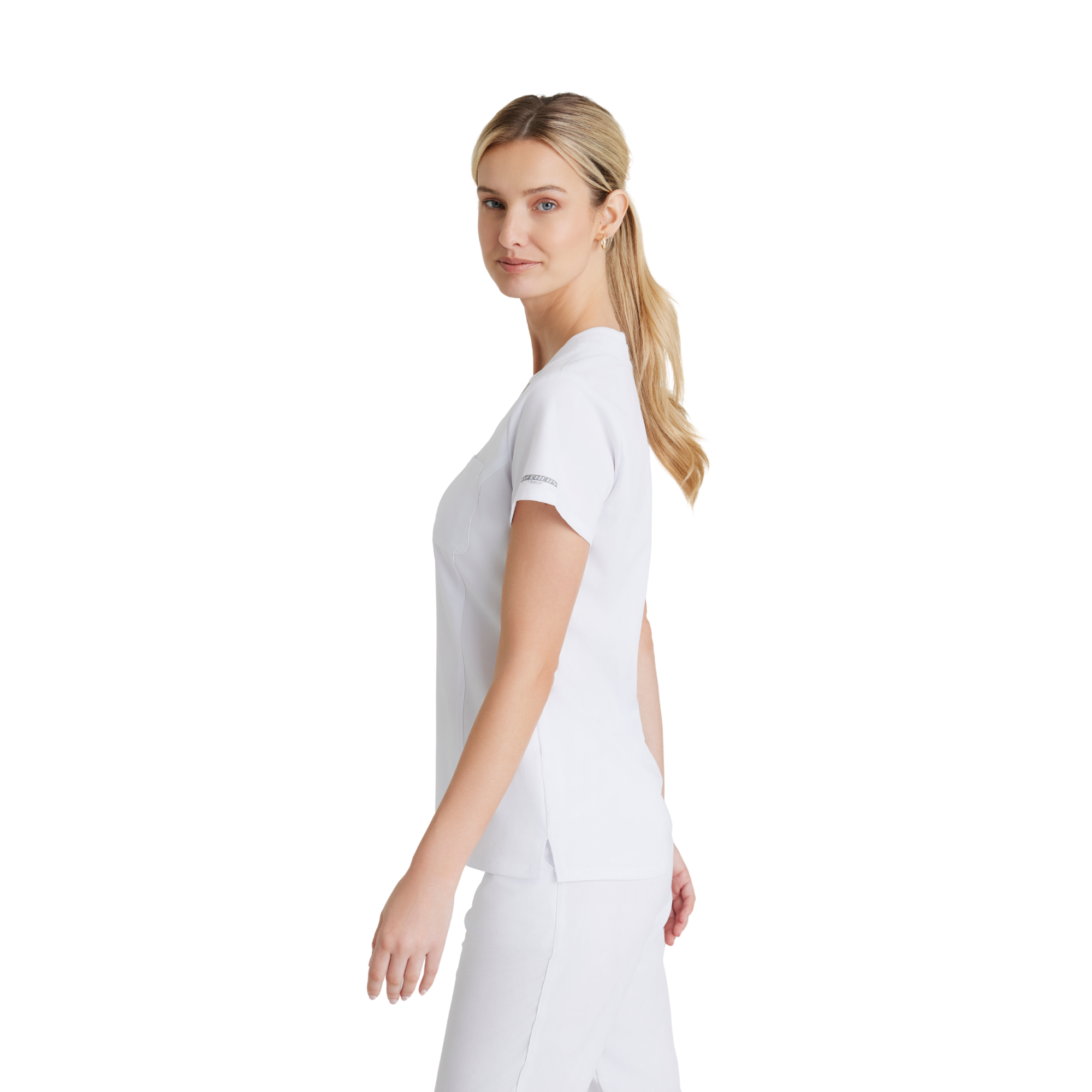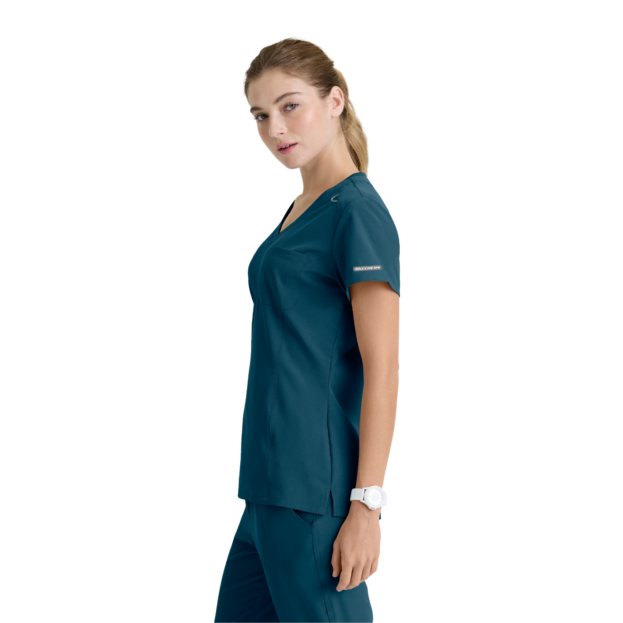 Adoptez un style professionnel et féminin avec la tunique Dignity de Skechers by Barco. Sa coupe classique et son ourlet légèrement évasé mettent en valeur la silhouette, tandis que son décolleté en V avec bord-côte contrasté apporte une touche moderne.