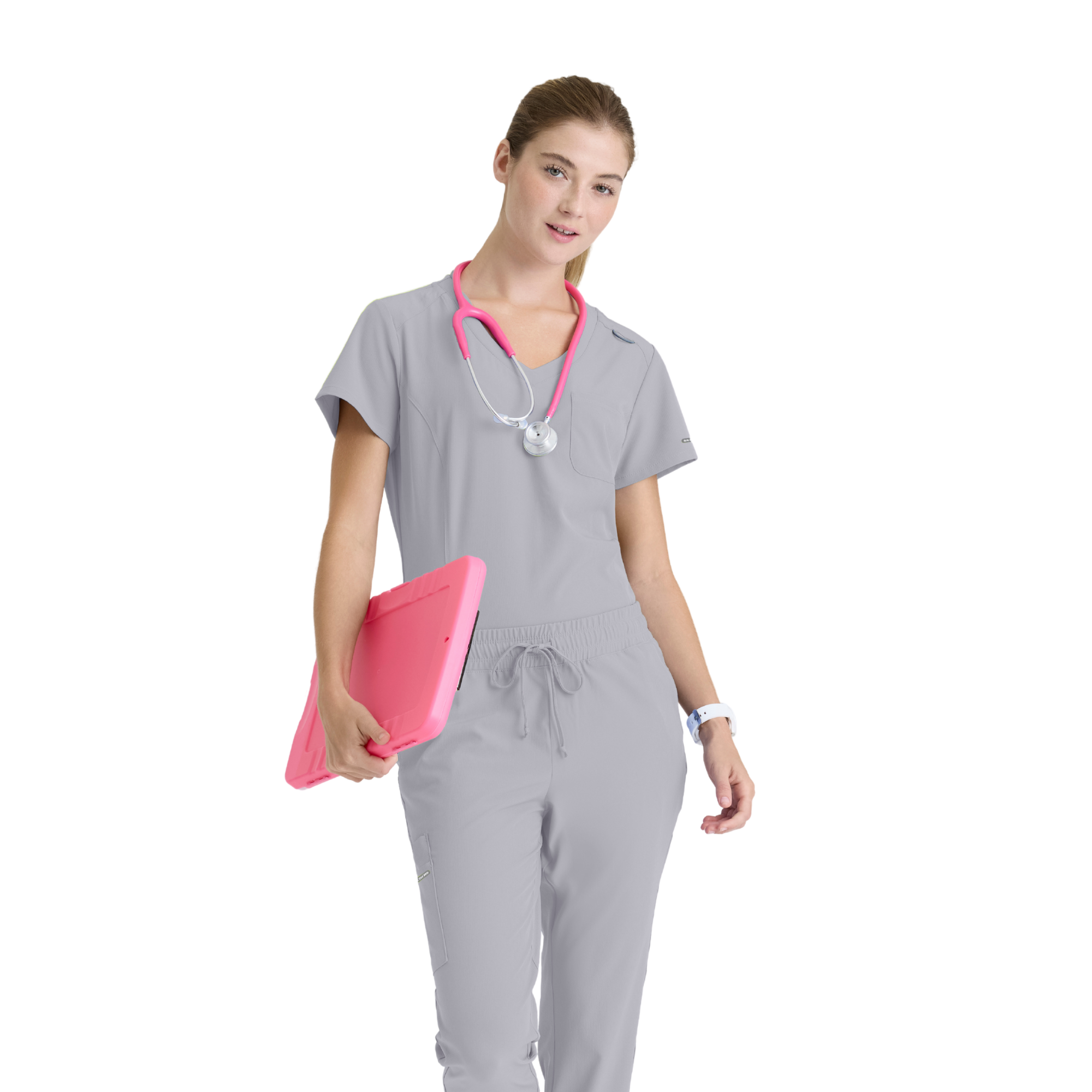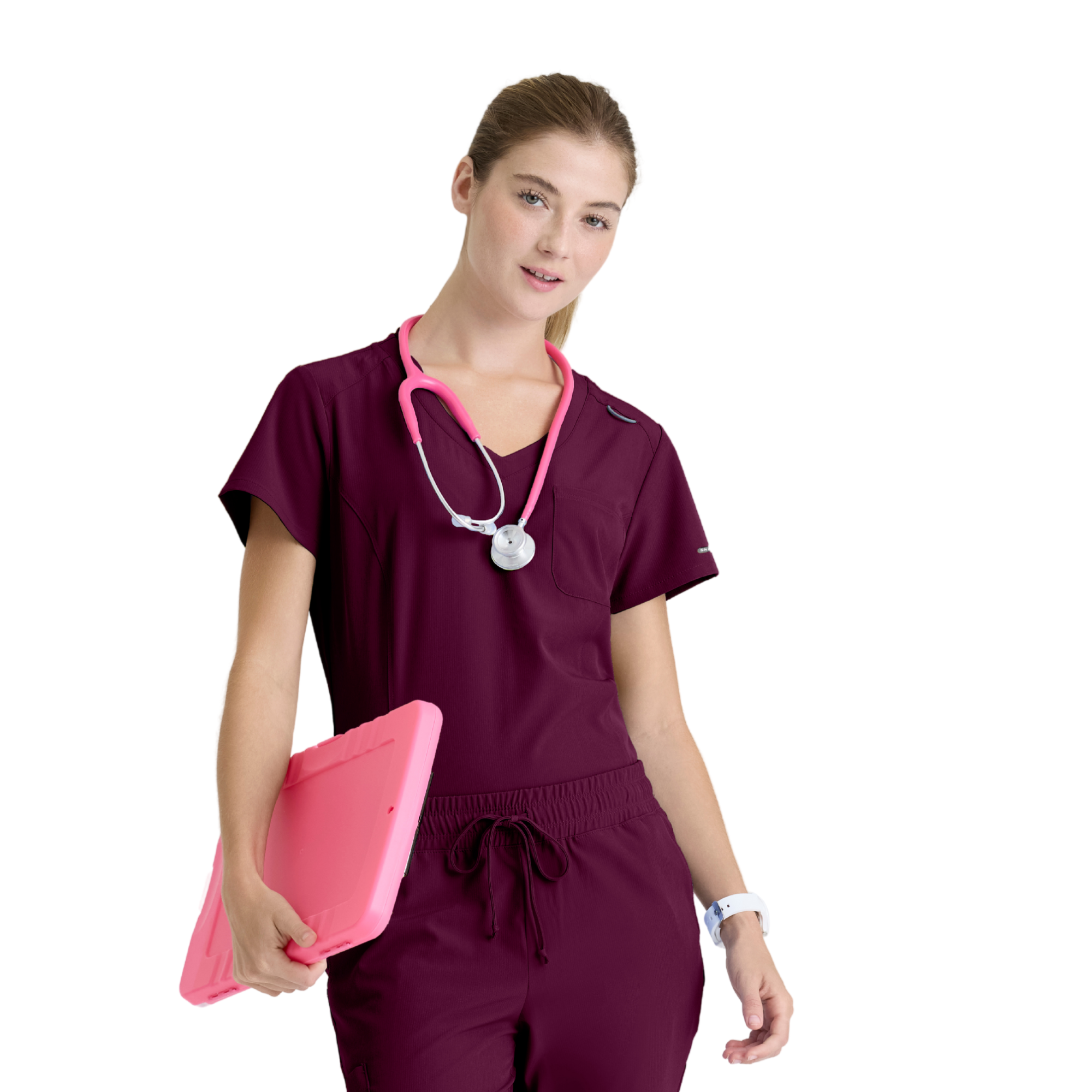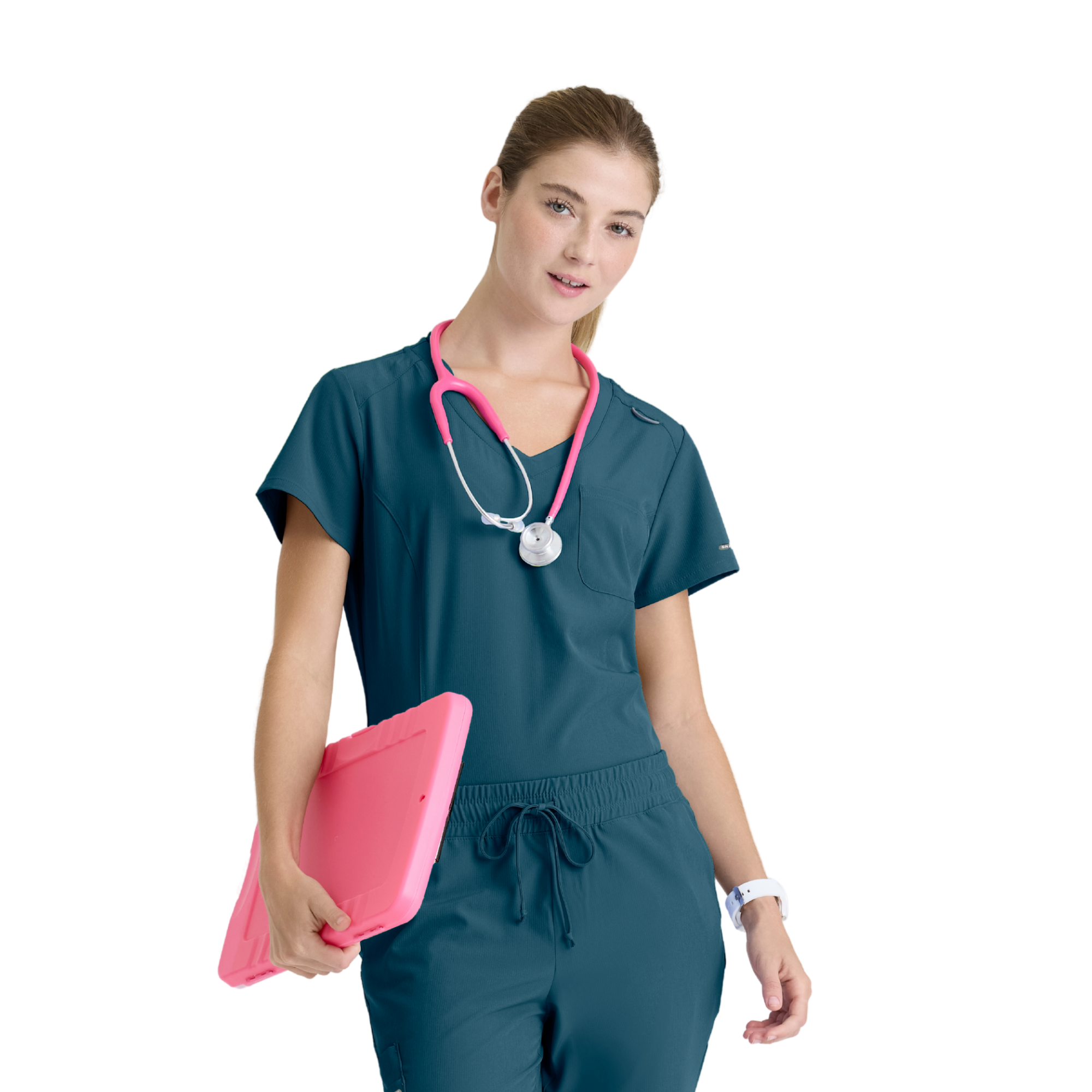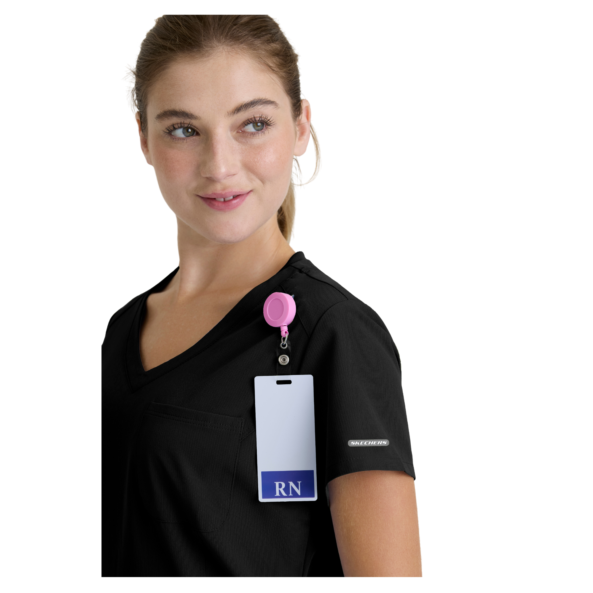 Adoptez un style professionnel et féminin avec la tunique Dignity de Skechers by Barco. Sa coupe classique et son ourlet légèrement évasé mettent en valeur la silhouette, tandis que son décolleté en V avec bord-côte contrasté apporte une touche moderne.