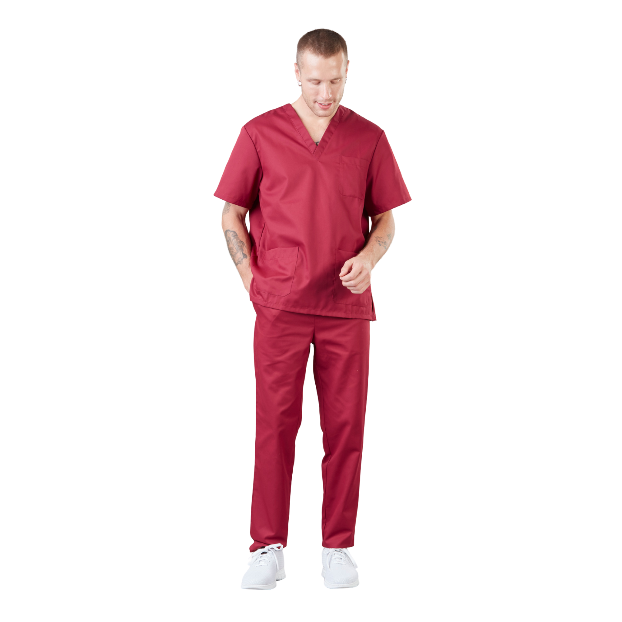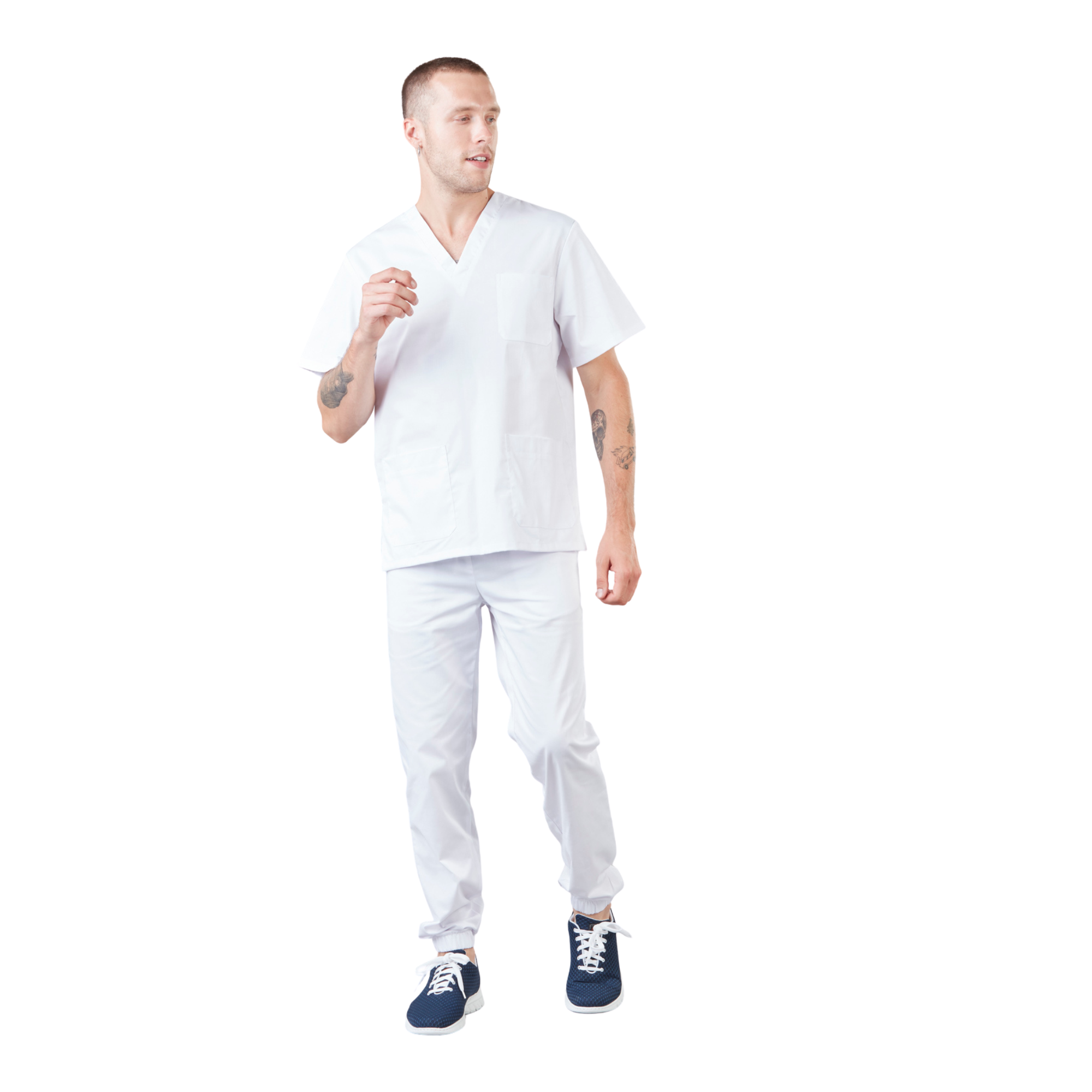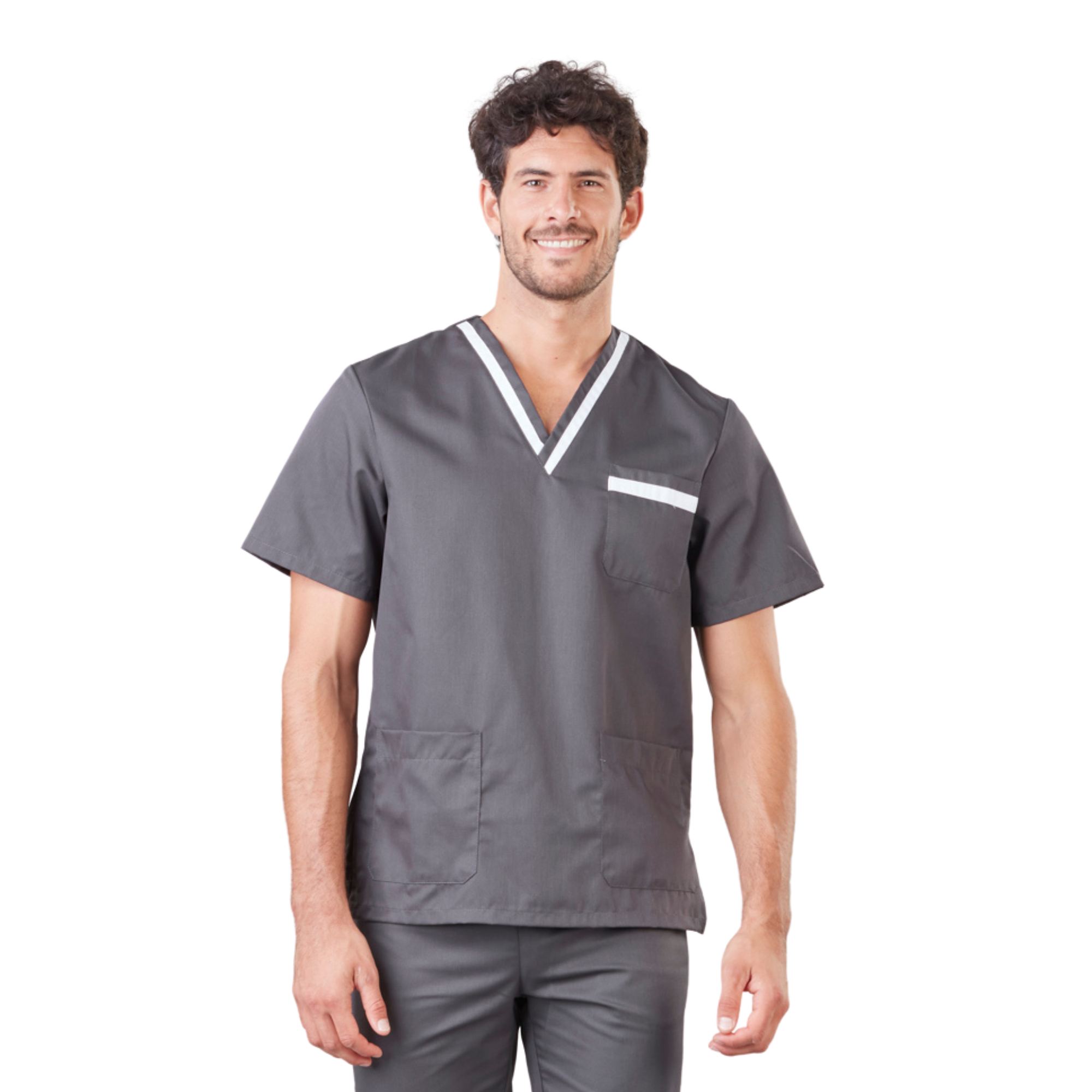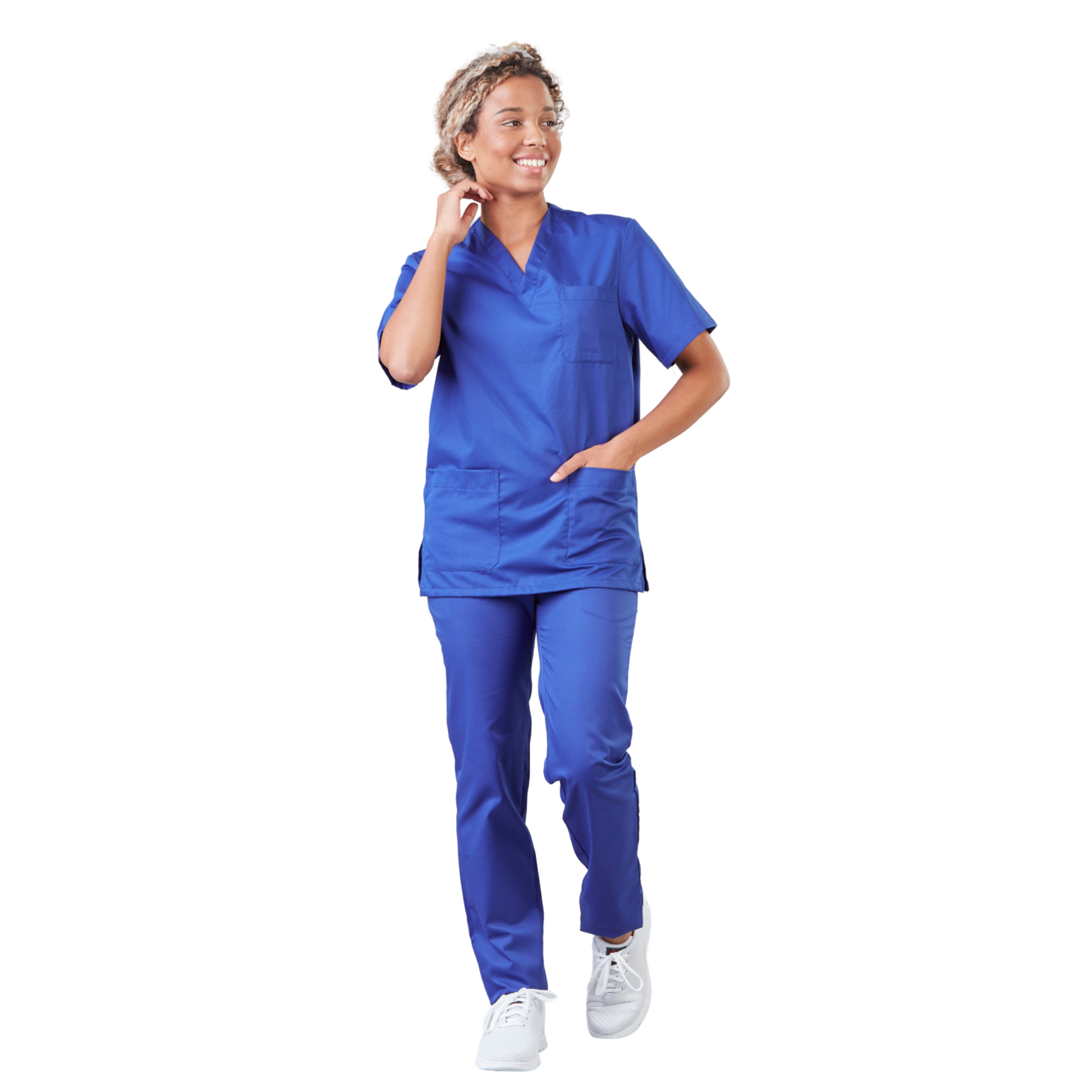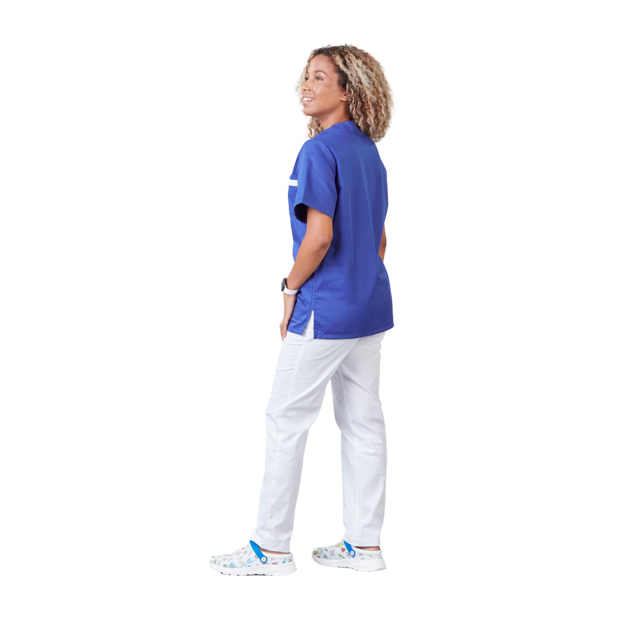 Tenue médicale mixte légèrement ajustée, col fantaisie avec croisure superposée pour un passage aisé de la tête.