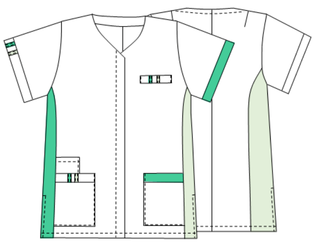 Tunique médicale femme, 1/2 manches montées, col en V, fermeture par pressions inox sous patte, longueur : 75 cm, 2 poches plaquées basses, 1 poche bip, 1 poche poitrine passepoilée, fentes sur les côtés.