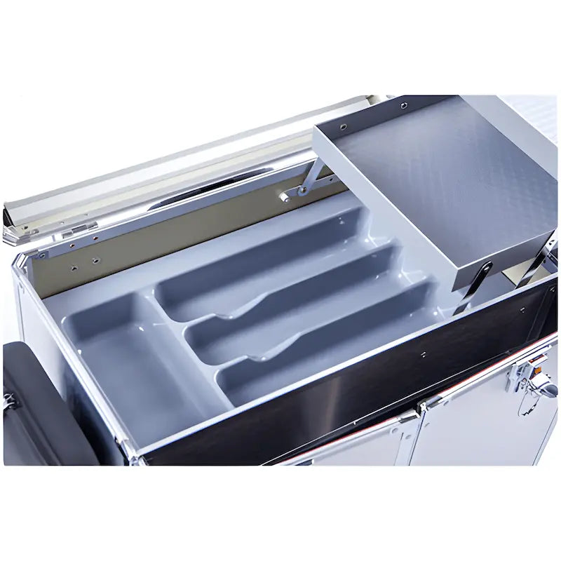 - Dimensions intérieures : couche d'instruments/de matériel de bandage 23,5 cm de profondeur, 45 cm de largeur, 10,5 cm de hauteur.
